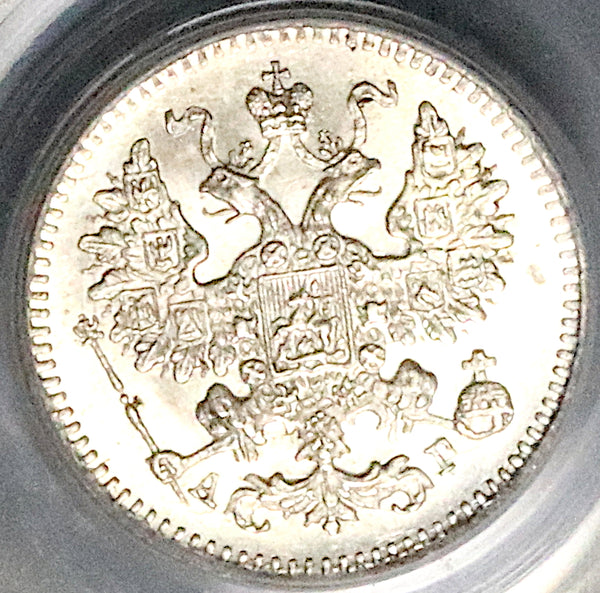 - Gem Mint State Uncirculated Russia Imperial silver 5 Kopeks coin.