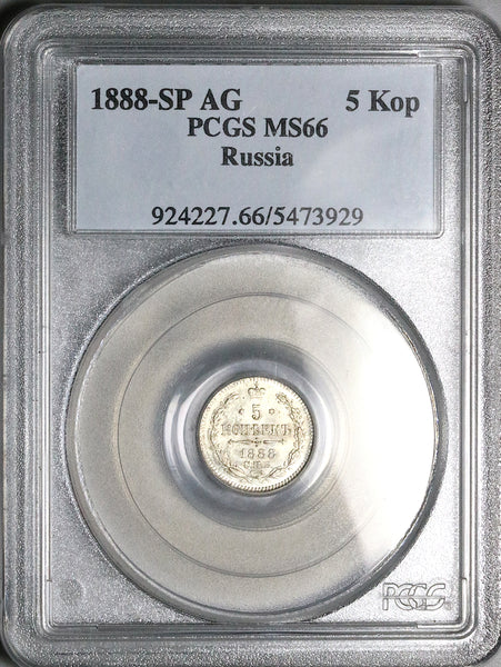 1888 PCGS MS 66 Russia 5 Kopeks CNB AГ Alexander III Czar Silver Coin POP 6/2 (25101202D)