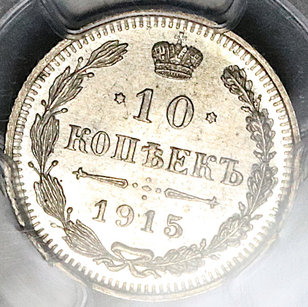 1915 PCGS MS 66 Russia 10 Kopeks Gem Nicholas II WWI Silver Coin (25100301C)